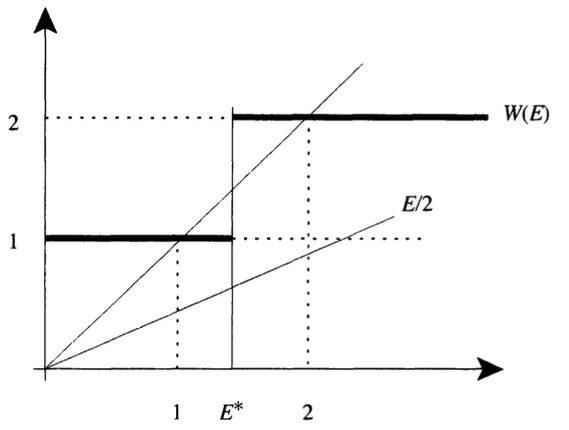 - 由于我们假设信号投资对生产力无任何促进作用, 均衡效率关于信号门槛