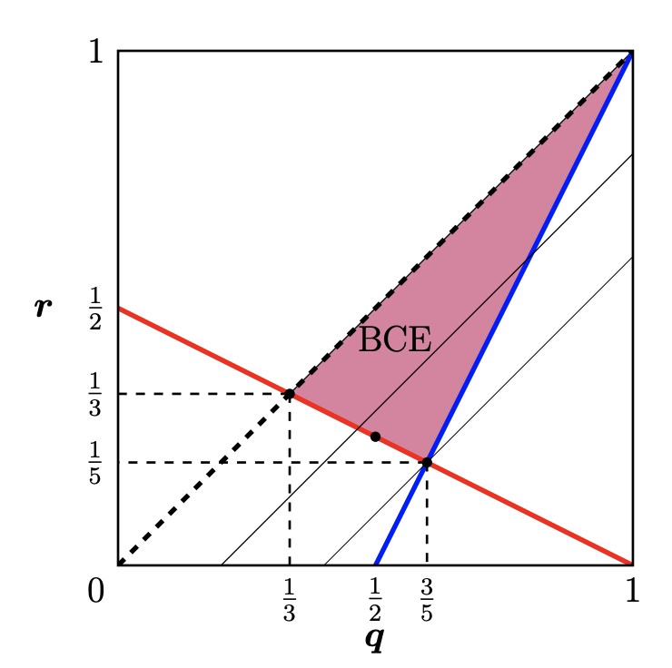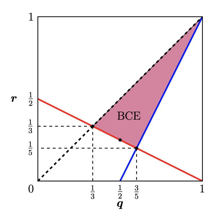 设计者最喜欢的结果是 或 . 但是, 这两个结果不是 BCE. BCE 集合可以看成是信息设计者的 “选择集”, 他可以通过信息设计来选择其最偏好的 BCE 结果.